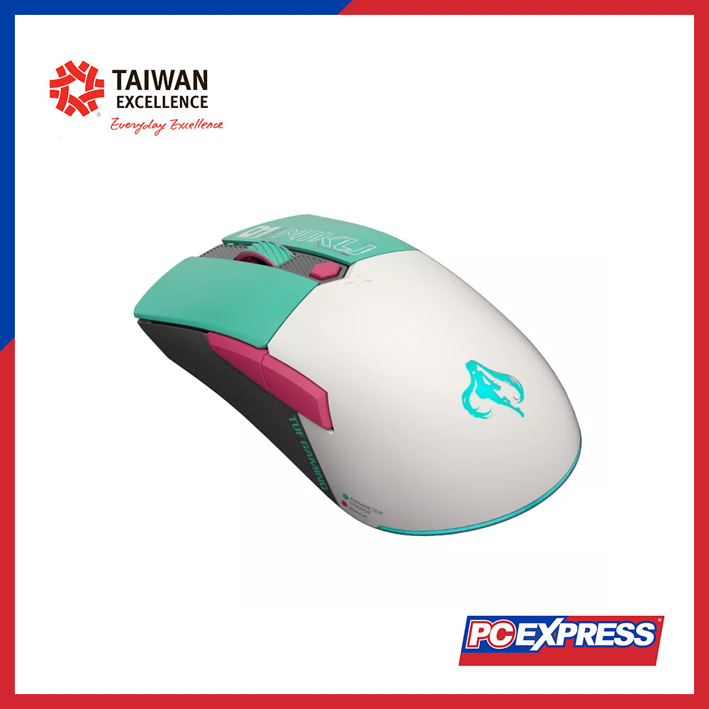 The TUF Gaming Mini Wireless Mouse Hatsune Miku edition is an ultralight 65-gram mouse with a form factor optimized for portability and comfort. It is the perfect on-the-go companion, offering great flexibility with tri-mode connectivity and featuring up to 134 hours of battery life in Bluetooth® mode. Its mechanical switches boast a 100-million-click lifespan for astounding longevity. This special Hatsune Miku edition combines TUF Gaming’s mechanical-armor aesthetics with Miku’s signature white, turquoise, and pink color scheme, embodying the vibrant and playful Miku spirit.
